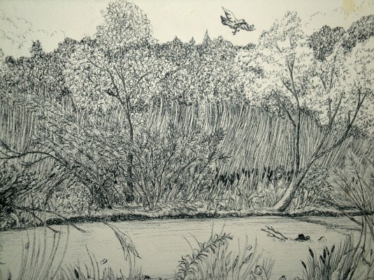 If it weren’t for the boiling August heat, this is where I’d like to be right now…watching the tide come in and out on Turkey Creek, in my own backyard. Living in a house so close to a swamp (“marsh” is the politically correct term if you are in real estate) is a bittersweet blessing. On the one hand, there is endless beauty and peace that inspires me to draw; on the other, when circumstances align (like the alignment of planets, almost) such as a full moon, high tide, and a four to six inch sudden downpour, the backyard becomes a lake and, once in a great while, my husband’s studio (a.k.a enclosed garage) gets cleansed, much like baptism by immersion. We have learned to cope with this disappointing situation by not keeping valuables on the floor, though sometimes we forget and get caught by surprise (such as the night about a year ago when our daughter was in a wreck during a rainstorm and while we went to be with her on the side of the interstate, our son was at home dealing with the flooded studio! We didn’t care a lick about the damaged stuff because we were so grateful she was okay!). Even though this is the bitter part of the blessing, it is still very sweet to appreciate this beautiful place on our tiny “island” on Turkey Creek and feel like we hear the heartbeat of heaven in the midst of the burbs. It’s just that sometimes it beats too loud and fast and we get slammed with a double whammy! Many things in life are like this, I think, and we have to learn to take the bitter with the sweet.