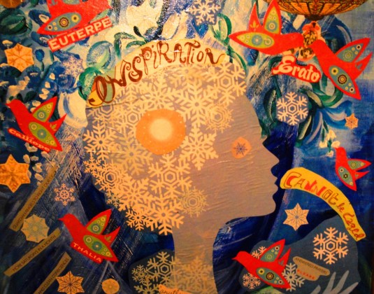 Inspiration Cannot Be Caged…Mixed Media detail…Did you know there are 9 Muses in Greek Mythology? They each have a special gift and purpose to inspire creativity in mere mortals like me. I made this wintry painting/collage about the Snowflake Woman whose snowflake hair symbolizes the uniqueness of the individual artist whose voice cannot be squelched by oppression. The redbirds flying around her head are creative ideas and from this particular issue of Skirt magazine last year there was an article on the Muses of Greek Mythology. I chose four that inspire me the most, whose names you can find under the redbirds: Calliope, means “Beautiful Voice” and she is the patron of epic poetry; Erato, means “Passionate” or ”Lovely” and she is the patron of lyric poetry about love and eroticsim; Euterpa, means “Rejoicing Well” and she is the muse of poetry and music; Thaelia, means “Festive” and she is the muse of comedy. I don’t worship them but I honor what they mean and drew strength from what they represent at a time when my creative voice was at risk of suppression by trivial, controlling people who by their very nature attempt to squelch creativity. This artwork reminds me that inspiration cannot be caged!