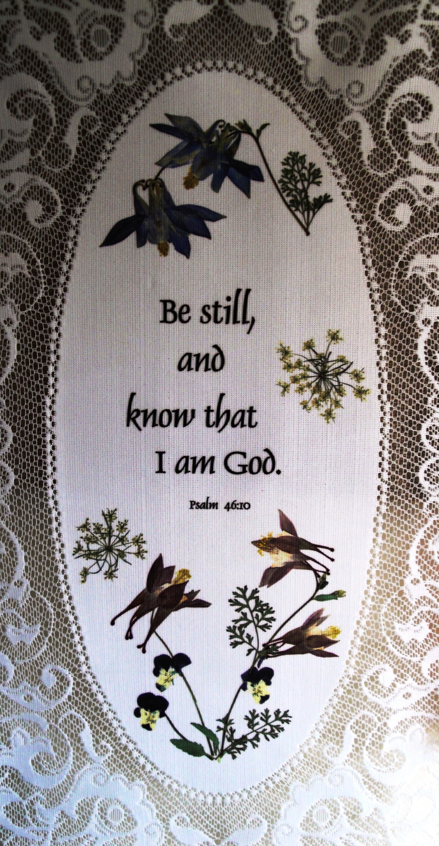 This image is of a lace wall hanging that has hung on the bedroom door of my mom’s assisted living suite since I gave it to her and my dad as a gift several years ago. It was one of the things my niece thought to bring over to my mom’s rehab room to make her more comfortable a few weeks ago. She hung it on her bulletin board at the foot of her bed amidst family photos and get well cards. Mom was only there a few days before she had to go back to the hospital and the room had to be cleared out for the next person. But while she was there we talked about this lace wall hanging, how she would stare at it at night when she couldn’t sleep after dad was gone and it brought her such peace. I need to stare at it now and hear God’s whisper, “Be Still…”